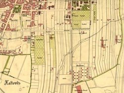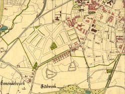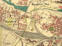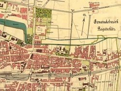 Zielon± lini± zaznaczona jest granica Katowic z ok. 1880 r. W znacznym stopniu pokrywa się ona z granic± dzisiejszej dzielnicy ¦ródmie¶cie. Ówczesna granica wyja¶nia nazwę ulicy Granicznej (public domain)
