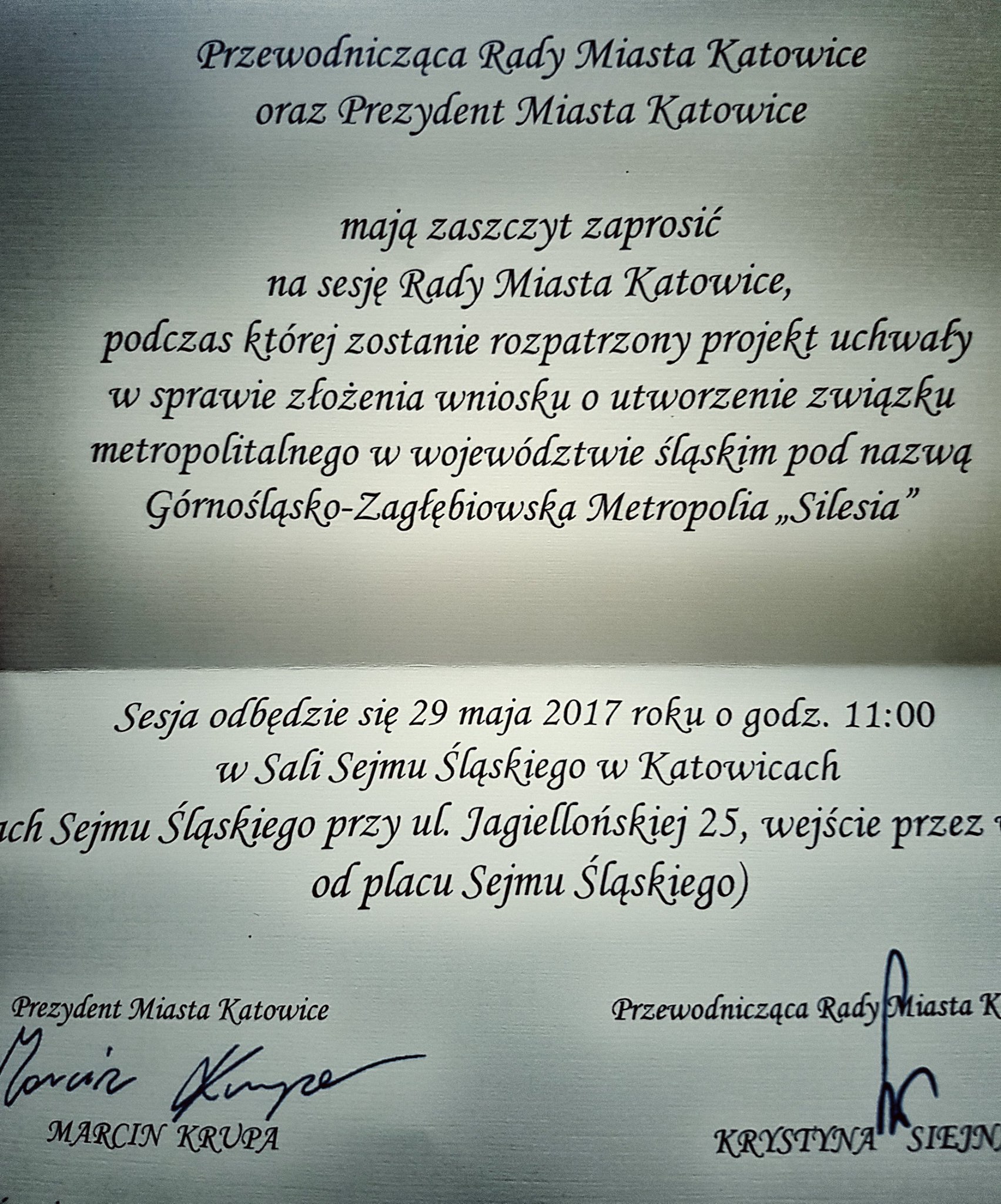 Zaproszenie na uroczystą sesję w sali Sejmu Śląskiego w Katowicach z udziałem samorządowców z 41 gmin, dotyczącą utworzenia z tych gmin metropolii, zawierało nazwę metropolii, która była skrzętnie ukrywana przez cały proces konsultacji społecznych z mieszkańcami - Górnośląsko-Zagłębiowska Metropolia "Silesia".