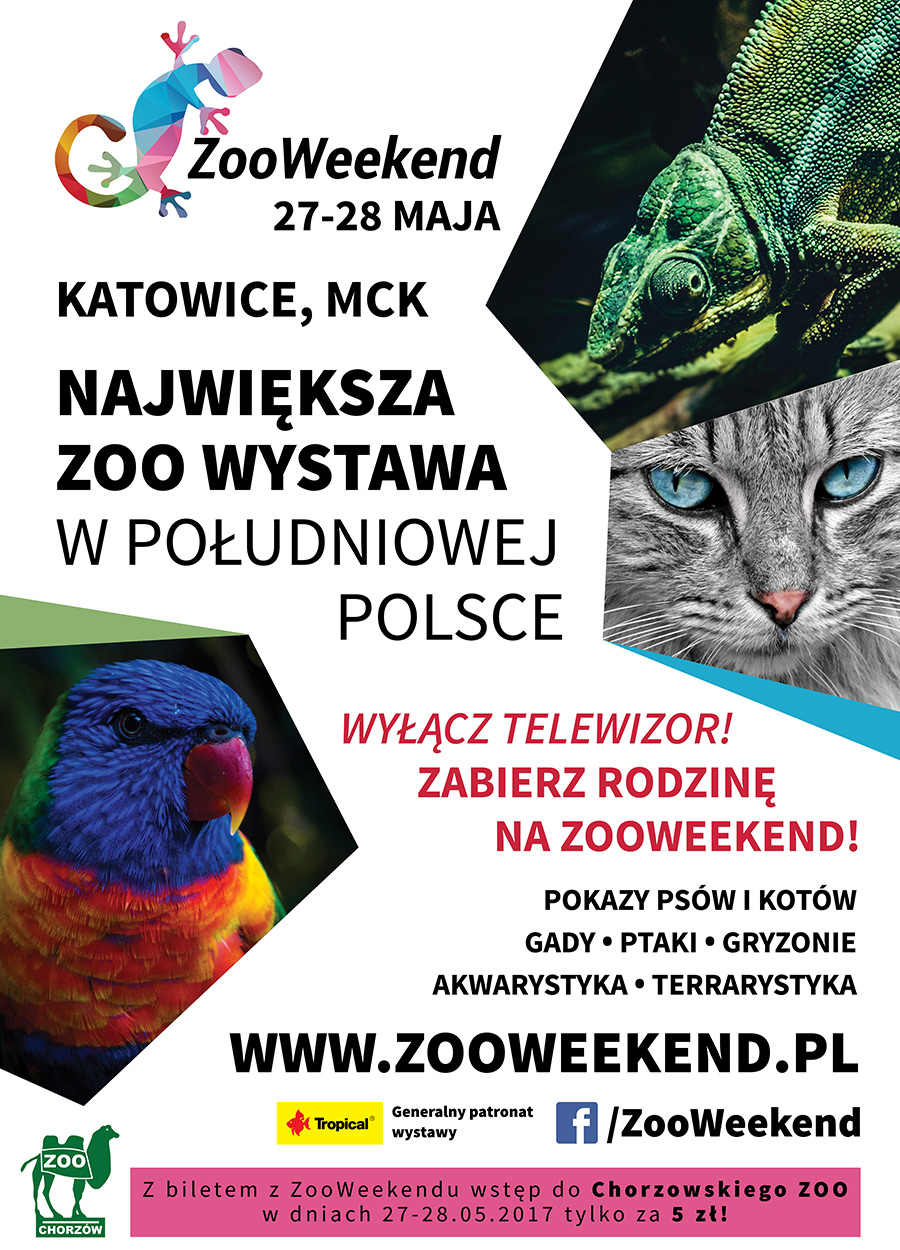 "Wyłącz telewizor, zabierz rodzinę na ZooWeekend" - takimi właśnie słowami organizatorzy zachęcają mieszkańców Katowic i okolic do odwiedzenia największej wystawy zoologicznej w południowej Polsce. Wydarzenie odbędzie się w dniach 27 i 28 maja w godzinach 9:00 – 18:00 na terenie katowickiego Międzynarodowego Centrum Kongresowego.