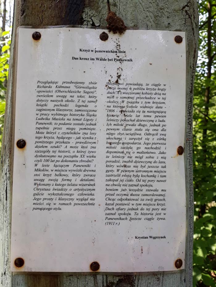 "Krzyże zwykle stawia się przy drogach, ale ten, choć ogromny, stoi daleko od najbliższej, nawet nie drogi, ale leśnej ścieżki. Jego zzieleniały ze starości kształt zlewa się z drzewami i jest praktycznie niezauważalny dla tego, kto nie wie gdzie szukać... Kto zatem i kiedy wystawił go w tym odludnym miejscu z którego do najbliższych zabudowań jest w każdą stronę po kilka kilometrów? Powiada się w Panewnikach, że to pewien leśniczy, dawno temu, jeszcze na początku XIX wieku chciał w ten sposób odkupić swoje winy i uwolnić się od ducha kobiety, którą tu zabił. Nikt nie wie czy to prawda, ale ta historia, przekazywana z pokolenia na pokolenie do dziś odstrasza wielu od samotnych wędrówek po okolicy." - PortierBlog