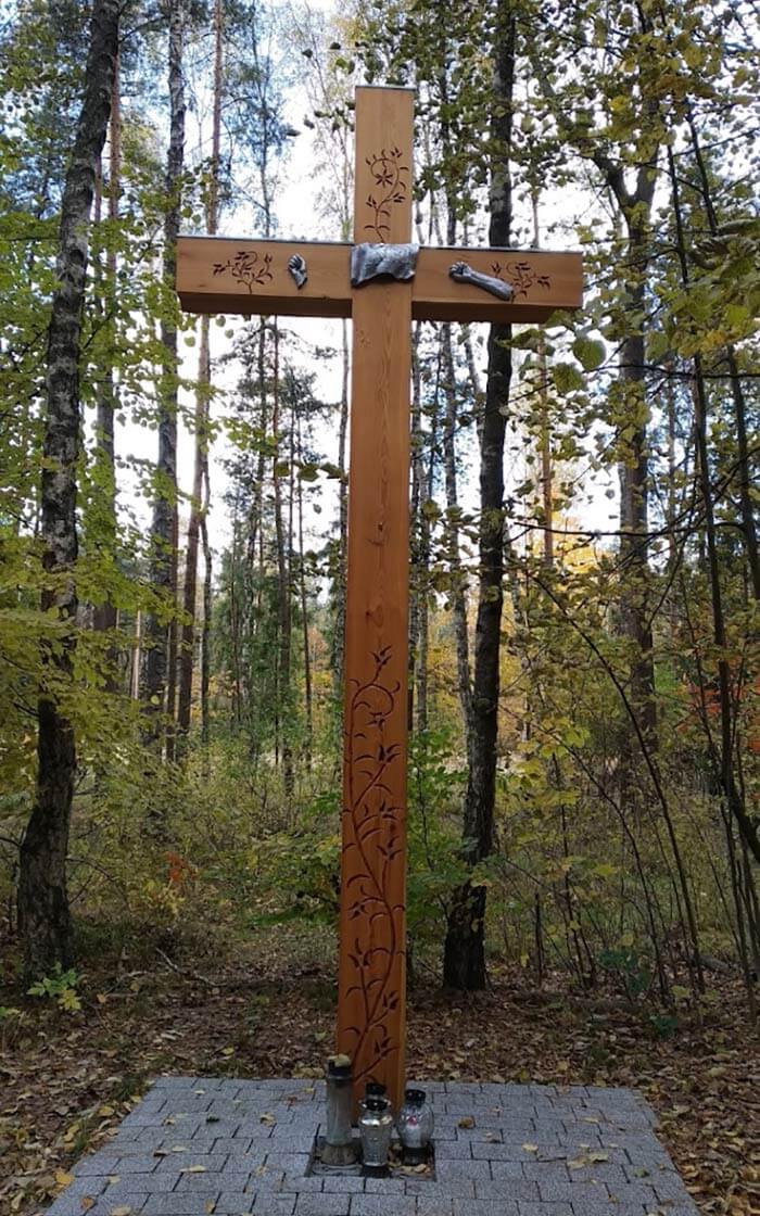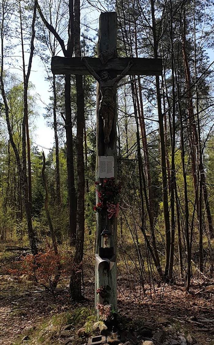 Teraz nic już z tego nie zostało. Krzyż zniszczono. Już same belki krzyża, ogromne, ponad 200-letnie, były cenne. A te zamieniono na nowe, z kuriozalnym roślinnym zdobieniem, rok temu. Trudno tu oceniać intencję, ale to wykonanie... wraz z wyłożeniem kostkami... w środku lasu? Zatem klimat miejsca zniszczono doszczętnie już wcześniej. Teraz zniszczono figurę... Na nowych belkach przetrwała ledwie kilka miesięcy.