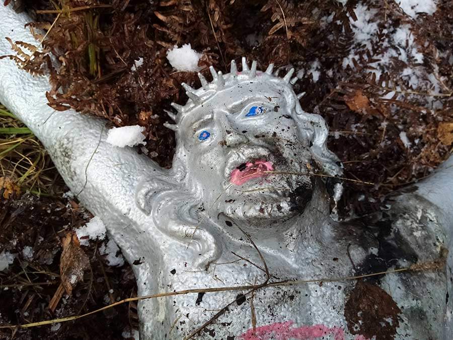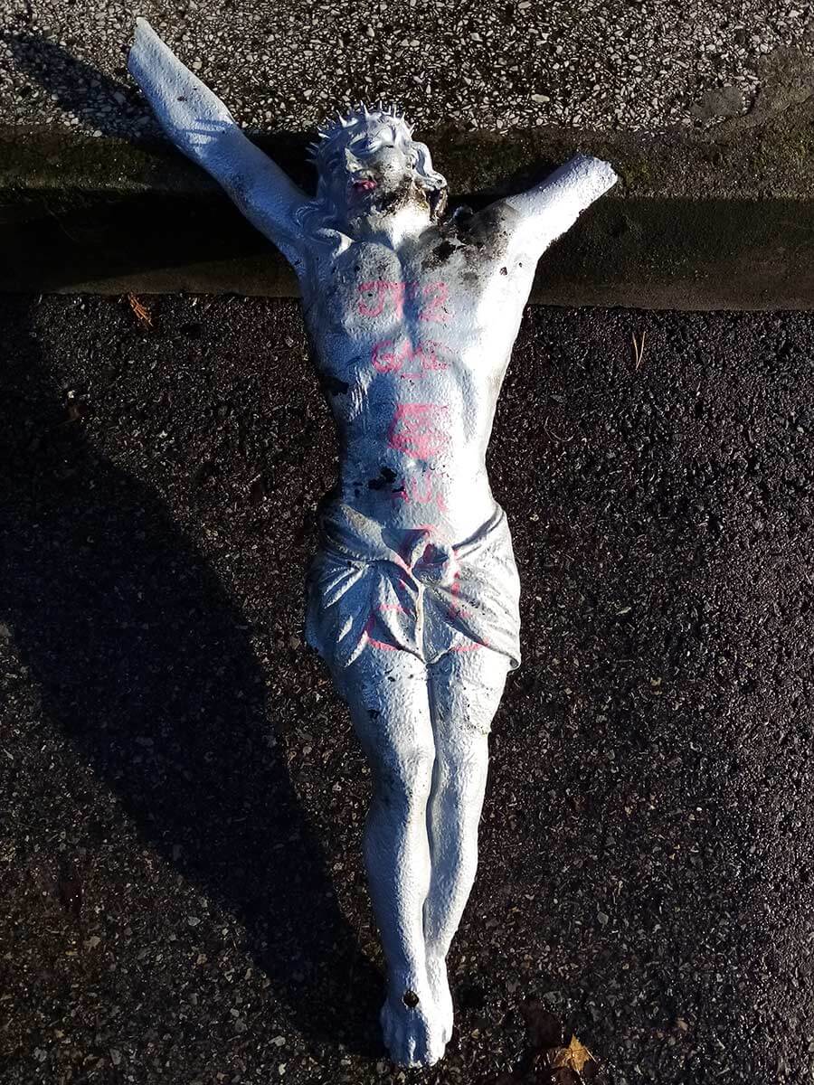 A co wydarzyło się pół roku temu latem? Ślady na figurze wskazują, że była prawdopodobnie palona w ognisku i tłuczona. Twarz wizerunku pokryto "makijażem", a na ciele napisano "JP2 GMD" (pierwotnie "Jan Paweł II Gaude Mater Deus", w slangu młodzieżowym GMD ma różnie tłumaczone rozwinięcie ośmieszające lub szkalujące Jana Pawła II) satanistyczny pentagram, wulgaryzm i obsceniczny rysunek. Trudno jest domniemywać wiek sprawców, jednak ich motywy są wyraźnie profanacyjne. Wzburza nie tylko drastyczna nienawiść czynu na podłożu religijnym, ale też jego wymiar historyczny, ponieważ mowa tu o wyjątkowo starym zabytku, który był do tej pory ogólnodostępny w lesie.