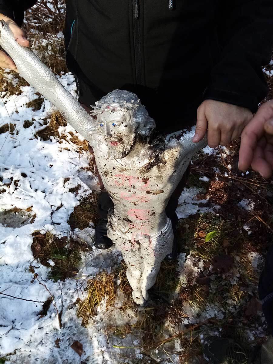 Lipcowy znalazca niestety nie miał świadomości rangi znaleziska. Jak przekazał redakcji: Wtedy myślałem że to pewnie jacyś "gimboateiści" urządzili sobie zabawę w profanację krzyża. Szczęśliwie wykonał fotografię, która stała się świadectwem dalszych losów ściągniętej z krzyża figury. Jak tylko przeczytał artykuł, pojechał w to samo miejsce, jednak niczego już nie znalazł. W naszej redakcji powstała jednak myśl, by przeszukać okolice tego znaleziska, ponieważ pomimo rozmiarów lasu, była wątła nadzieja, że gdzieś dalej mogła ona jednak pozostać. W sile dwóch osób, nasz współpracownik z osobą towarzyszącą, pojechali w wskazane miejsce i po kilkunastu metrach natrafili na metal pod śniegiem. Figurę z miejsca odebrał zaalarmowany brat zakonny ze staropanewnickiej parafii, na miejscu odmówił modlitwę i zabrał ją na probostwo.