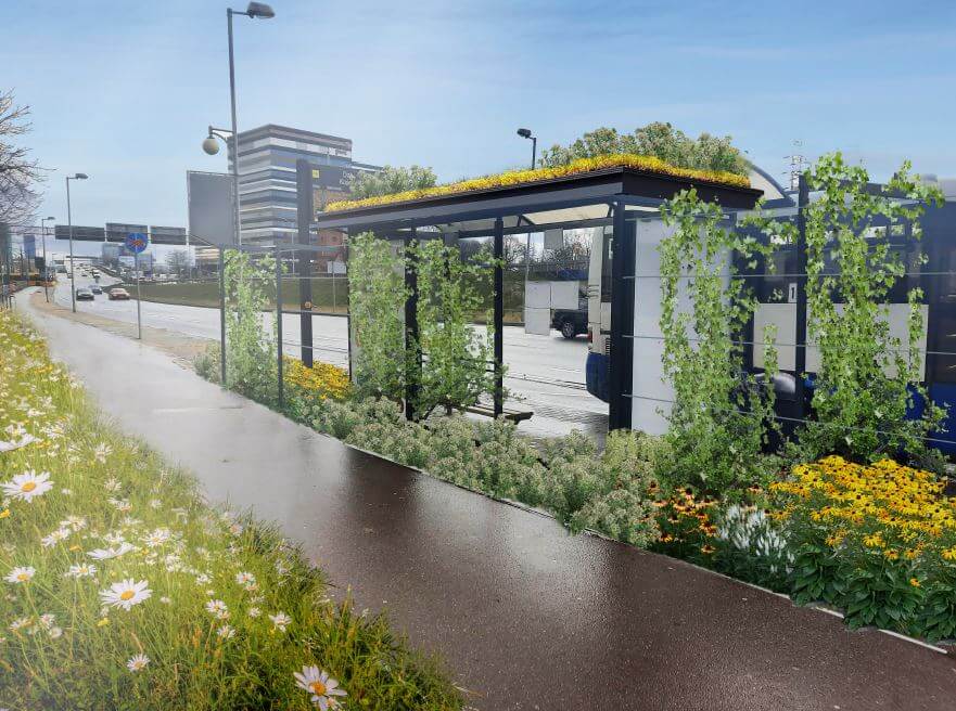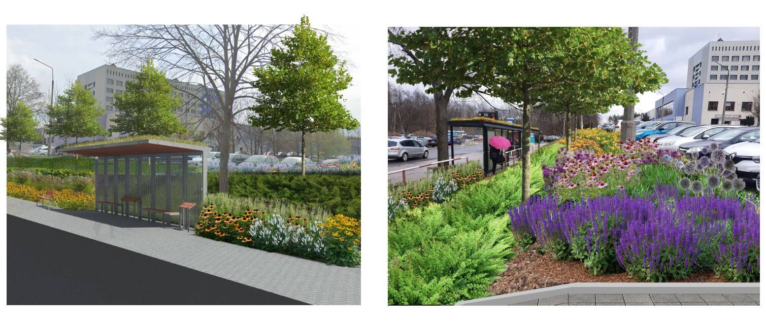 Pierwszym z miejsc będzie zielony przystanek autobusowy Ochojec Szpital przy ul. Ziołowej. Obok przystanku posadzone zostaną trzy drzewa dające cień, a wokół krzewy, byliny, trawy ozdobne. Nad przystankiem powstanie roślinny dach. Kolejna realizacja to zielony przystanek autobusowy przy ul. Jagiellońskiej. Zyska on zielony dach, który opóźni spływ wody deszczowej i obniży temperaturę. Posadzone zostaną niskie krzewy, byliny, trawy oraz rośliny pnące. Dużo zieleni zyska również przystanek autobusowy Dąb Kościół przy ruchliwej ul. Chorzowskiej. Miejsce to charakteryzuje się wysokim poziomem hałasu, porywami wiatru oraz nasłonecznieniem. Dodatkowo przestrzeń wokół przystanku jest bardzo niewielka, więc projekt jest tu bardzo wymagający. Na wiacie przystanku pojawi się roślinny dach gromadzący wodę z opadów. Natomiast część brukowanej powierzchni zostanie zastąpiona krzewami ozdobnymi, bylinami, trawami i pnączami. Kolejna lokalizacja to przystanek autobusowy przy słynnej rzeźbie Żyrafy w Parku Śląskim. Pomimo sąsiedztwa parku, na przystanku przy słonecznej pogodzie nie ma się gdzie schronić przed dokuczliwym skwarem. W tym miejscu powstanie zielony dach, a obok przystanku posadzony zostanie klon polny. Oprócz tego pojawi się tam duża ilość niskiej roślinności – krzewy ozdobne, byliny, trawy, winorośl na podporach.