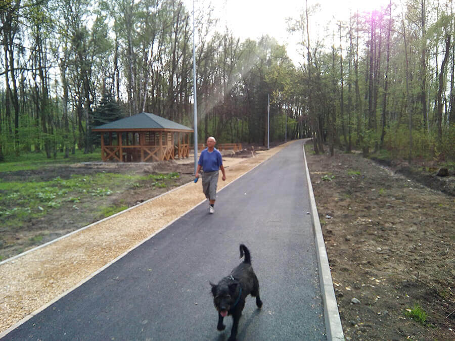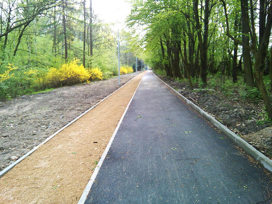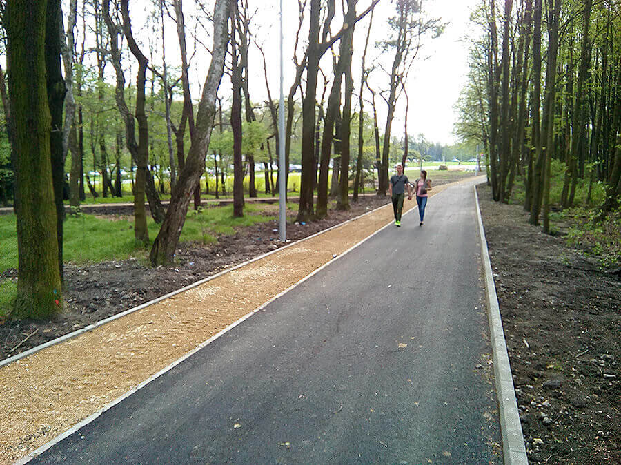 Podobnie z szutrową ścieżką. Jest ona powiązana z równocześnie tworzoną siecią szutrowych ścieżek wśród drzew parku. Obok wybudowano też dużą drewnianą altanę z ławami, z której będą mogli korzystać wszyscy (poza rowerzystami). W tej części parku, do tej pory ciemnej i niesympatycznej zrobi się tłoczno. Należy to również pochwalić. Ewidentnym jednak błędem jest przedłużenie szutrowych ścieżek z części leśnej do tej wzdłuż rolkostrady. Już samo mimowolne wykopywanie przez pieszych kamieni na asfalt utrudni rolkarzom życie. Nie wspominając o tym, że miejsca dla rolkarzy zwyczajnie tam nie będzie, bo zajmą je wózki z dziećmi pchane po asfalcie przez rodziców do altany.