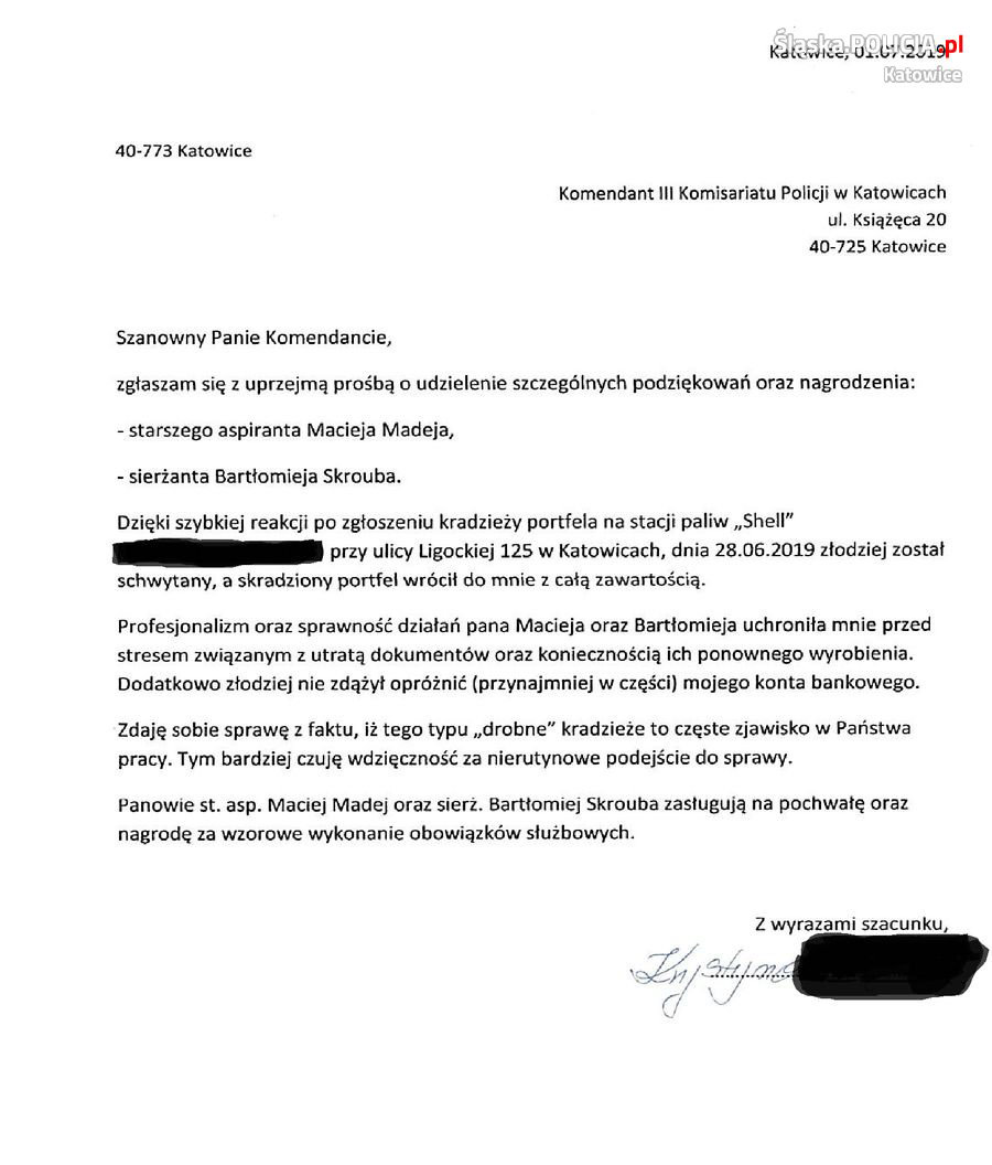 Do Komisariatu Policji III w Katowicach wpłynęły podziękowania jednej z mieszkanek Katowic. Adresatem podziękowań byli st. asp. Maciej Madej, sierż. Bartłomiej Skrouba. Kobieta w swojej korespondencji podkreśliła zaangażowanie funkcjonariuszy oraz jak to ujęła sprawność działania. Działania podjęte przez policjantów skutkowały zatrzymaniem złodzieja, a wszystkie skradzione przedmioty w stanie trafiły ponownie w ręce poszkodowanej.