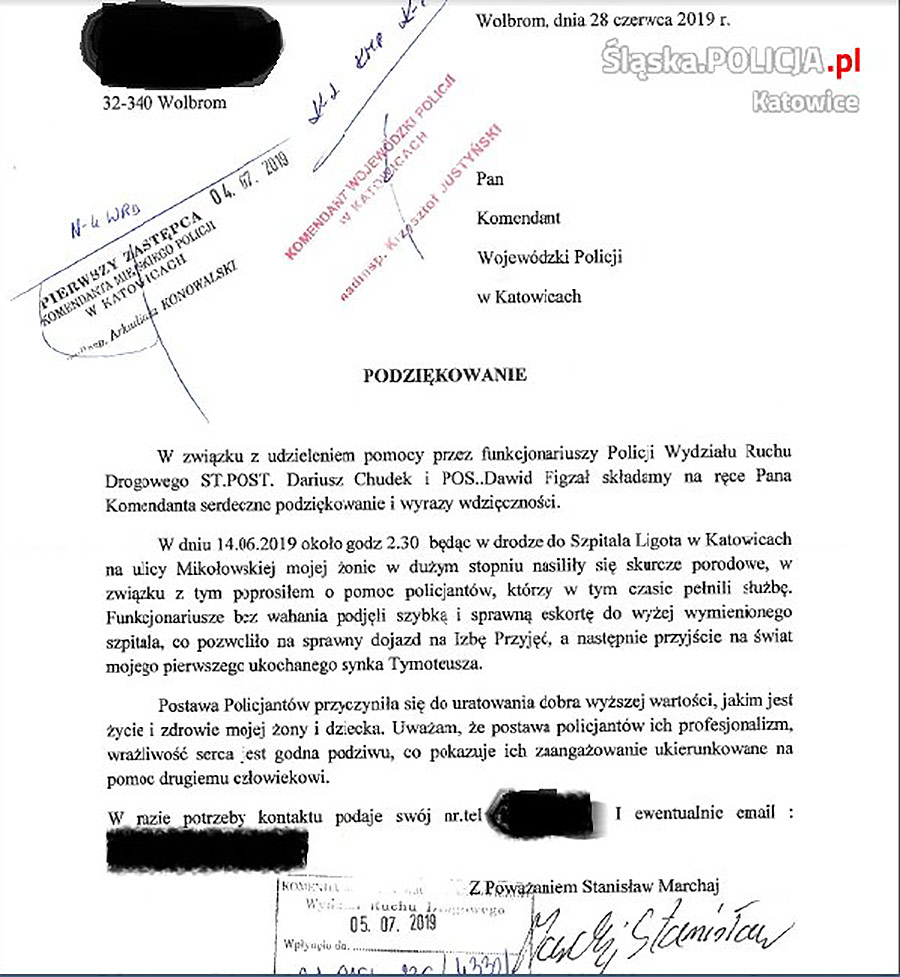 Za pomoc, opanowanie w niecodziennej sytuacji i zaangażowanie podziękowania przypadły policjantom z Wydziału Ruchu Drogowego. St. post Dariusz Chudek i post. Dawid Figzał 14 czerwca 2019 roku ok. godz. 2.30 pomogli przyszłym rodzicom dotrzeć sprawnie i bezpiecznie wprost na "porodówkę" ligockiego szpitala. Jak wskazał w swoich podziękowaniach świeżo upieczony ojciec, policjanci bez wahania podjęli eskortę i pomogli bezpiecznie dotrzeć do szpitala kobiecie, której rozpoczęła się akcja porodowa. Autor podziękowań podkreślił profesjonalizm, wrażliwość i zaangażowanie ukierunkowane na pomoc drugiemu człowiekowi.