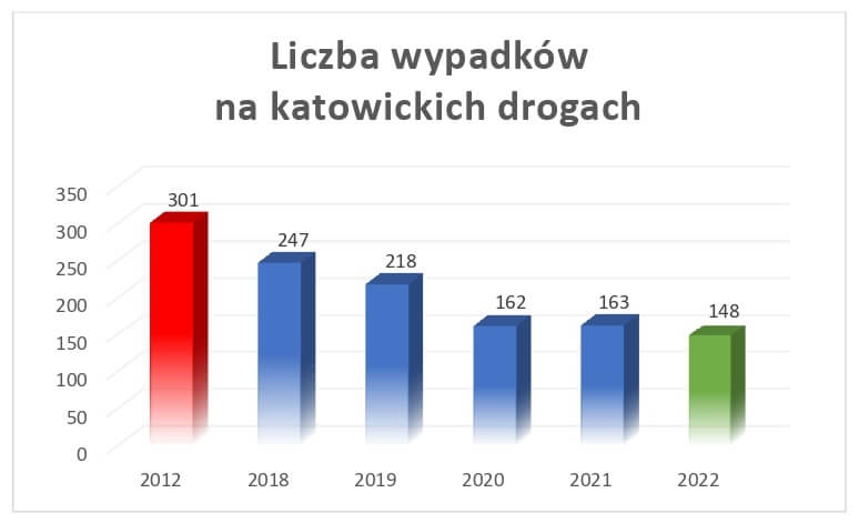 Na bezpieczeństwo mają wpływ także inwestycje takie jak przebudowa skrzyżowania Armii Krajowej i Kościuszki, czy węzła w Giszowcu, których głównym celem było oddzielenie ruchu tranzytowego od lokalnego. Działania miasta przynoszą efekty, bo ilość wypadków ogółem w ostatnim roku jest zdecydowanie mniejsza, natomiast jednostkowe sytuacje w 2022 roku wpłynęły na odnotowanie 9 wypadków śmiertelnych, których 2021 było 6, w 2020 r. było ich 7, a w 2019 - 12.