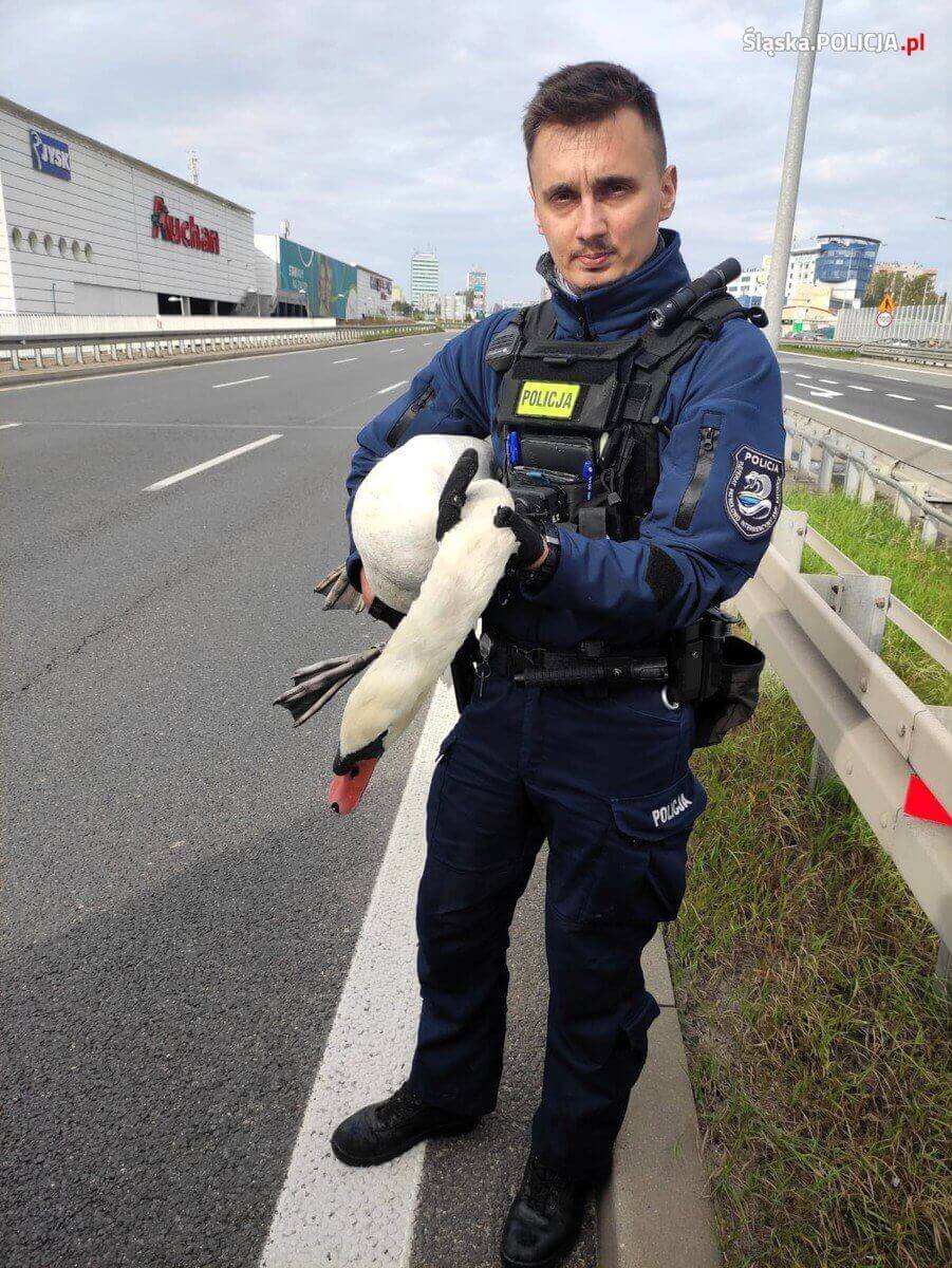 Dzisiaj przed południem starszy sierżant Dominik Syska i sierżant Dawid Bomba otrzymali nietypowe zgłoszenie od dyżurnego. Z przekazu, jaki usłyszeli wynikało, że po autostradzie w Katowicach ma chodzić duży łabędź. Niezwłocznie udali się we wskazane miejsce i potwierdzili, że na zjeździe z autostrady A4 na drogę krajową numer 86 znajduje się skrzydlaty uczestnik ruchu drogowego. Stwarzał zagrożenie nie tylko dla siebie, ale również dla podróżujących ruchliwą trasą.