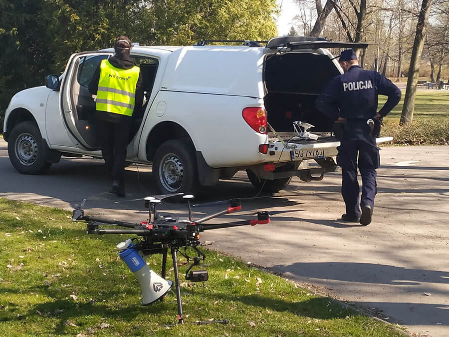Załoga pojazdu dowodzenia przez cały czas może monitorować zachowanie osób, które nie stosują się do obowiązujących obostrzeń. Policjanci i strażnicy miejscy przetestowali także możliwość wygłaszania komunikatów ostrzegawczych z powietrza, w warunkach miejskich, parku i w rejonie obszarów leśnych.