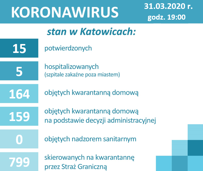 "Szanowni Mieszkańcy, obecny stan to: hospitalizowanych 1 (w szpitalu w Tychach), objętych kwarantanną z decyzjami administracyjnymi 18 osób, 162 osoby nadzór epidemiologiczny. Wyniki badań personelu i pacjentów z Medyków są ujemne. Dziękuję wszystkim za potraktowanie sytuacji poważnie i dostosowywanie się do zaleceń. Dziękuję Lekarzom i wszystkim Służbom za Waszą ciężką i wzorową pracę. Uprzedzając pytania i niepotrzebne plotki: liczba osób hospitalizowanych to nie to samo, co liczba osób chorych ani liczba osób będących zakażonymi koronawirusem. W przypadku podejrzenia o zakażenie koronawirusem pacjent jest umieszczany w izolatce, by nie zarażał innych chorych. Jeśli ktoś jest hospitalizowany to niekoniecznie znaczy to, że jest nosicielem koronawirusa albo jest chory na COVID-19. Niektóre osoby mają objawy chorobowe, ale jest to np. grypa. Dopiero po wykonaniu testu wiadomo, czy mamy do czynienia z zakażeniem koronawirusem."