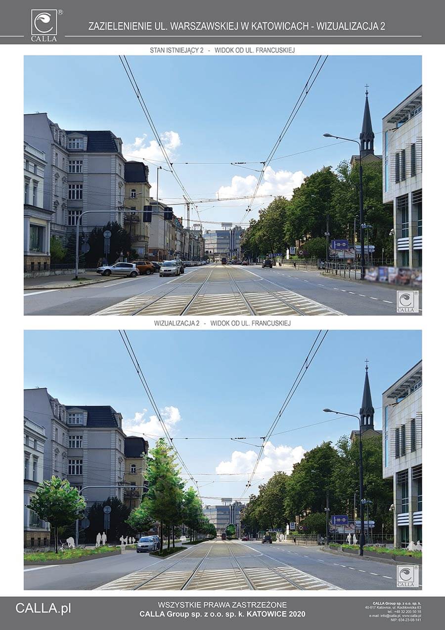 Ulica Warszawska jest ważną arterią drogową prowadzącą od katowickiego rynku w kierunku wschodnim – m.in. do Uniwersytetu Śląskiego i Uniwersytetu Ekonomicznego. Metamorfozę ulicy Warszawskiej prezydent Marcin Krupa zapowiedział jesienią 2018 r. w ramach swojego programu wyborczego „Umowy z mieszkańcami Katowic", w którym mówił m.in. o „przywróceniu zieleni na ulicach miasta" i „nasadzeniach drzew na ulicach".