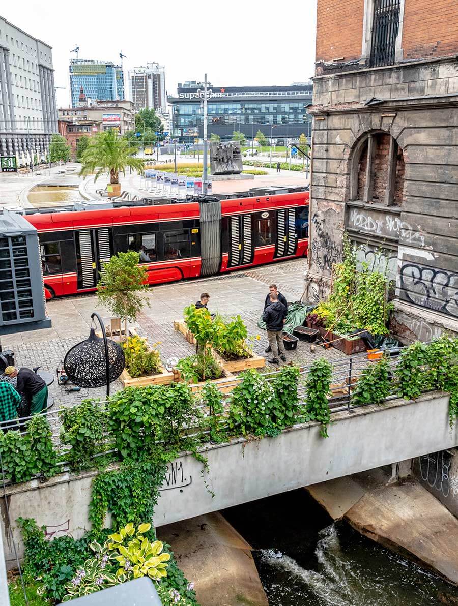 Nowe kwietne miejsce w centrum Katowic powstało dosłownie nad Rawą, ponieważ ulokowano je nad wylotem rzeki w miejscu znanym z neonu "Zachód Słońca". Za instalacją kwietników stoi jedna z polskich marek spożywczych.