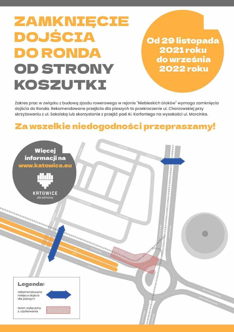 W okolicy inwestycji pojawiły się plakaty z informacją dla mieszkańców gdzie znajdują się najbliższe przejścia dla pieszych - to skrzyżowanie ulicy Chorzowskiej z ul. Sokolską lub przejście podziemne pod al. Korfantego na wysokości ul. Morcinka.
