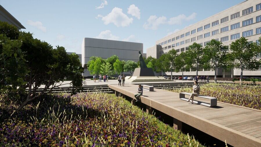 Na odnowionym placu pojawią się oczywiście meble miejskie, które pozwolą w pełni cieszyć się z nowej, dostępnej przestrzeni publicznej. Będą to ławki, leżaki, kosze na śmieci i stojaki rowerowe. Plac zostanie doświetlony nowymi lampami parkowymi, a posadzone drzewa otrzymają oddolną i boczną iluminację. Co ważne przebudowa zakłada także odnowienie terenu wokół przystanku autobusowego na ul. Jagiellońskiej w tym budowę dwóch niewielkich fontann po obu stronach placu.
