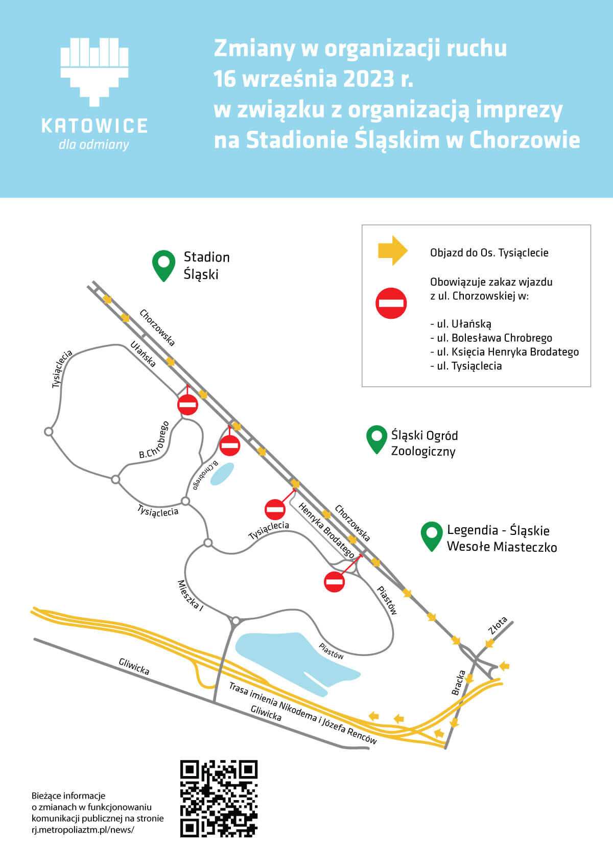 16 września (sobota) na Stadionie Śląskim odbędzie się duże wydarzenie muzyczne. Dlatego, podobnie jak przy poprzednich tego typu wydarzeniach, wdrożone zostaną zmiany w organizacji ruchu drogowego, by zmniejszyć uciążliwość imprezy masowej dla mieszkańców os. Tysiąclecia.