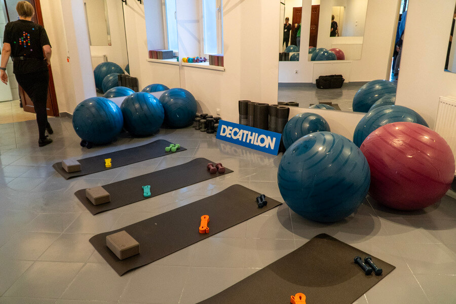 Natomiast przy wsparciu firmy Decathlon wyposażono salę gimnastyczną, która będzie pełniła również funkcję sali tanecznej. W otoczeniu lustrzanych ścian prowadzone będą różnorodne zajęcia ruchowe. Produkty i sprzęty do ćwiczeń sprawią, że zajęcia gimnastyczne czy cotygodniowe „fajfy" będą gromadzić tutaj wszystkich spragnionych ruchu, sportu, zdrowego trybu życia i kontaktu z innymi.
