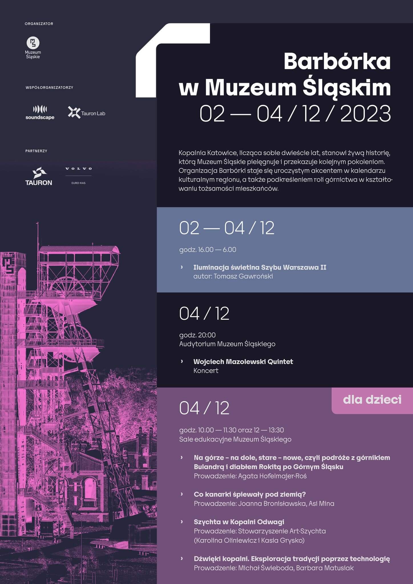 W te wyjątkowe obchody włącza się również Muzeum Śląskie, które znajduje się na zrewitalizowanym poprzemysłowym terenie dawnej kopalni „Katowice” oraz fundacja Soundscape. Organizatorzy przygotowali moc atrakcji m.in. warsztaty dla dzieci, wyjątkową instalację świetlną, którą przygotował Tomasz Gawroński, a zwieńczeniem obchodów górniczego święta będzie koncert grupy muzycznej Wojtek Mazolewski Quintet.