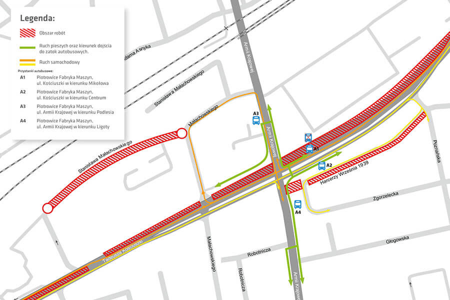– W związku z zakresem prac od czwartku 14 lutego największe zmiany czekają pieszych. Chodnik wzdłuż ul. Armii Krajowej od strony Mikołowa na odcinku od ul. Robotniczej do przystanku autobusowego „Piotrowice Fabryka Maszyn 3" zostanie wyłączony za wyjątkiem dojść do posesji. Dlatego osoby udające się na ten przystanek będą musiały skorzystać z wyznaczonych obejść drugą stroną ul. Armii Krajowej do utworzonego przejścia dla pieszych na wysokości tego przystanku – wyjaśnia rzecznik.