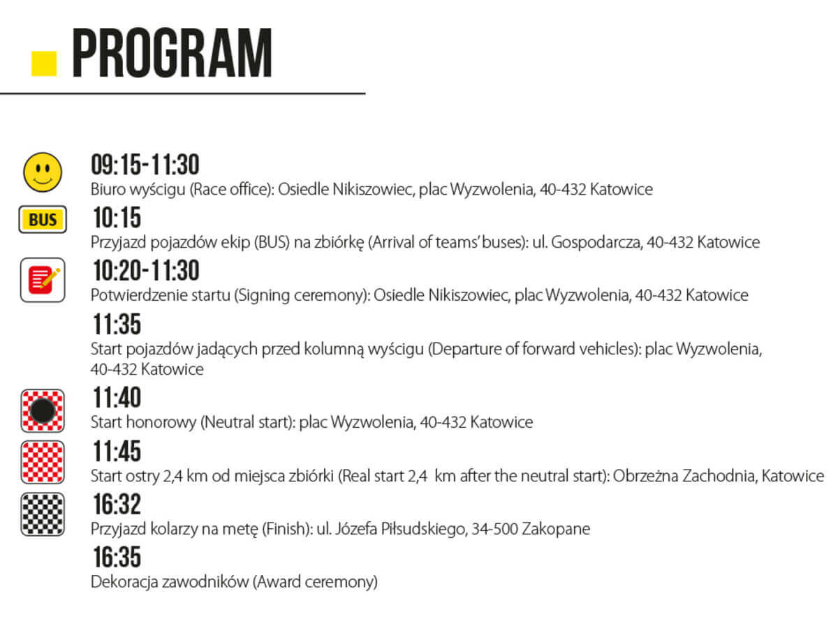 Z uwagi na wyścig, w Katowicach zostanie wprowadzona tymczasowa organizacja ruchu, a rozkłady jazdy komunikacji miejskiej ulegną zmianie. Szczegóły można znaleźć na stronie metropoliaztm.pl.