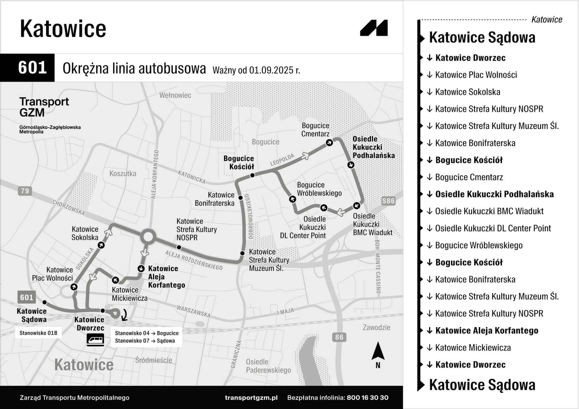 Od 1 września mieszkańcy Katowic mogą korzystać z nowej linii autobusowej nr 601. To długo wyczekiwane połączenie wreszcie skomunikowało Bogucice – jedną z najstarszych dzielnic miasta – ze Śródmieściem i Strefą Kultury. Autobusy kursują w obu kierunkach okrężną trasą, rozpoczynając i kończąc swoją podróż na Międzynarodowym Dworcu Autobusowym przy ul. Sądowej.