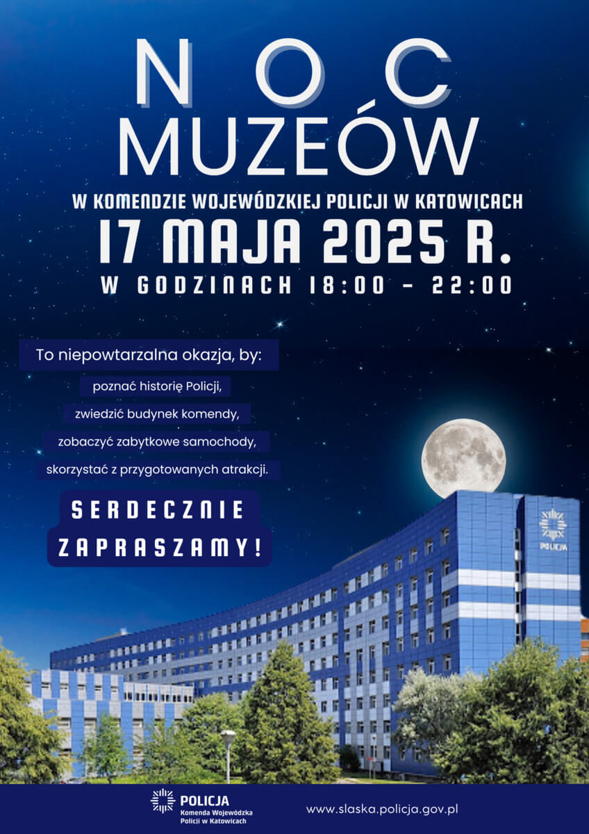 Po raz pierwszy w historii Nocy Muzeów Komenda Wojewódzka Policji w Katowicach otworzyła swoje drzwi dla mieszkańców. Zwiedzający mogli zobaczyć zaplecze techniki kryminalistycznej, wziąć udział w pokazach zabezpieczania miejsca przestępstwa, poznać policyjne wyposażenie i porozmawiać z funkcjonariuszami różnych pionów – wszystko w duchu edukacji i zbliżenia obywateli do pracy służb mundurowych.